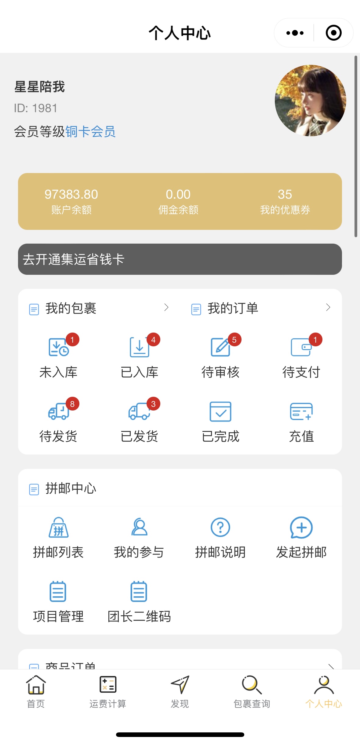 嗨轉寶集運小程序清晰明了的訂單管理系統:待打包、待支付、待發貨、貨到付款、已發貨一目了然
